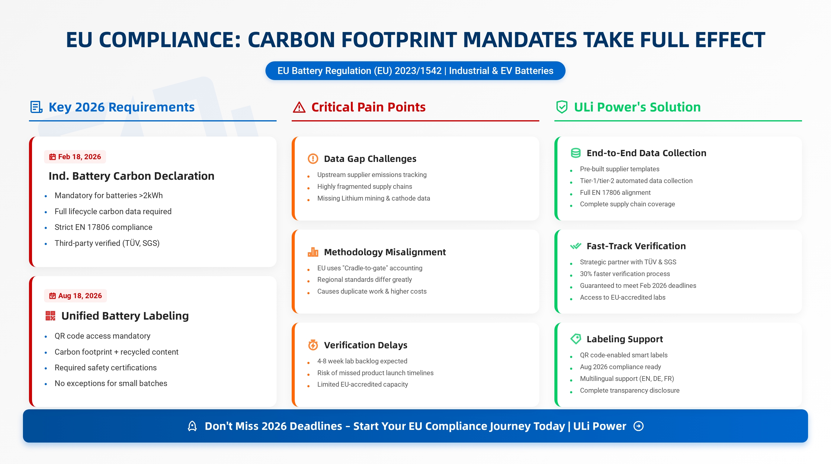 - EU Focus: Carbon footprint verification, QR labeling, and 2027 Battery Passport prep.