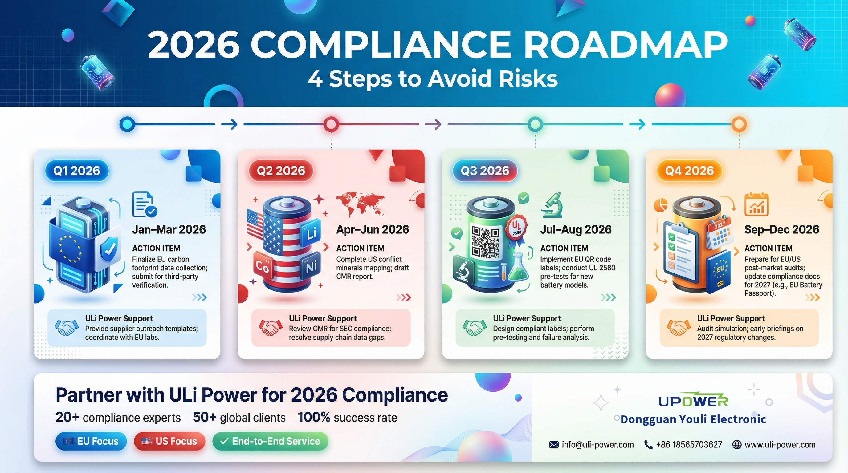 2026’s EU-US battery compliance rules are complex—but they don’t have to be a barrier to market access. ULi Power’s team of 20+ compliance experts (with EU CE/US UL certifications) has helped 50+ global clients launch batteries in欧美 markets, with a 100% success rate in meeting deadlines.