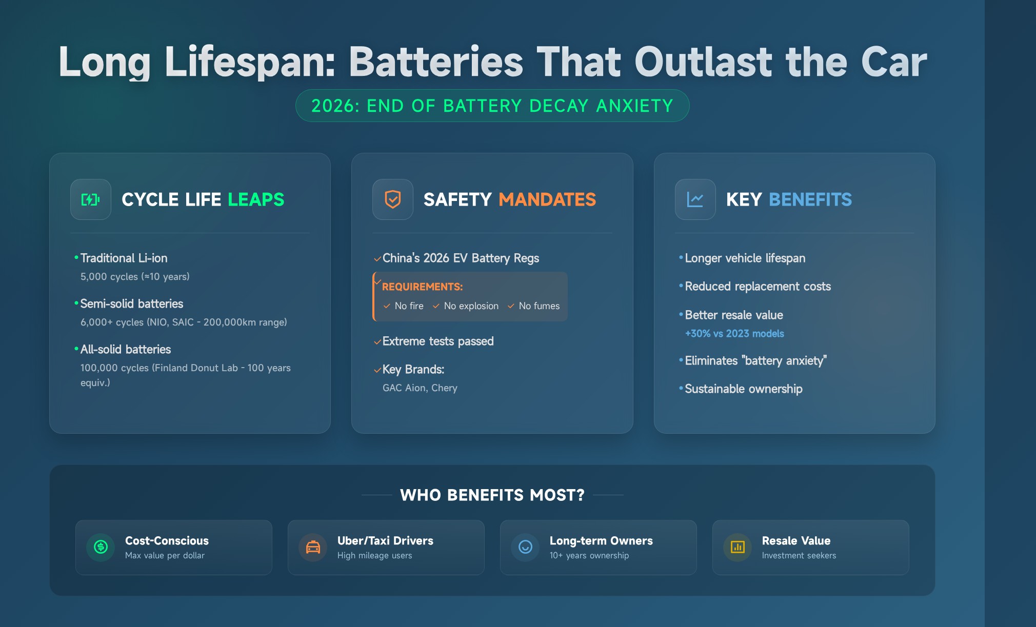 2026 will end the era of “battery decay anxiety,” as new chemistries and standards push lifespans to match or exceed vehicle lifecycles.