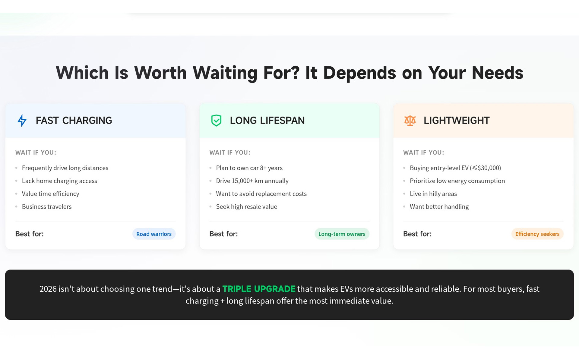 2026 isn’t about choosing one trend—it’s about a “triple upgrade” that makes EVs more accessible and reliable. For most buyers, fast charging and long lifespan offer the most immediate value, as they directly solve the two biggest pain points (anxiety over range and decay). Lightweight design, while impactful, is more of a “bonus” that enhances efficiency rather than fixing a critical flaw.